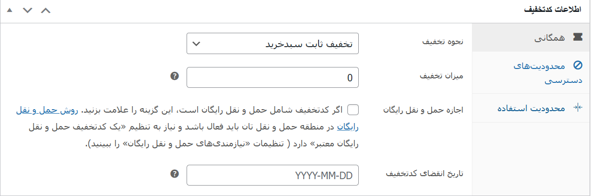 نوع تخفیف کوپن: میتوانید درصدی (مثلاً ۱۰٪)، مبلغ ثابت (مثلاً ۵۰ هزار تومان) یا تخفیف ارسال را انتخاب کنید.