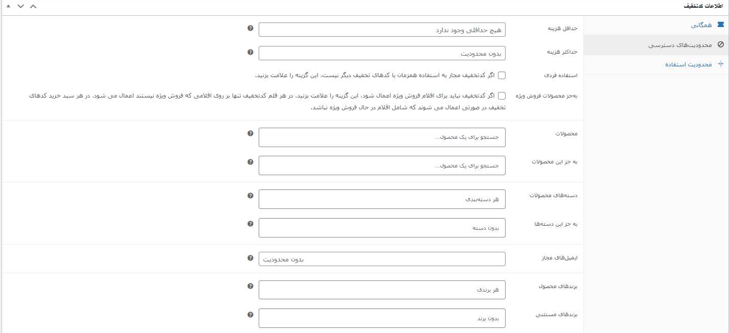 محدودیت برای محصولات یا دستهبندی خاص: تخفیف فقط روی محصولات مشخص اعمال شود.