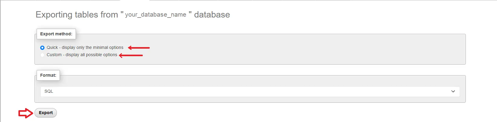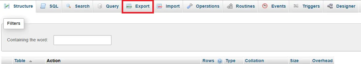 خروجی گرفتن را آغاز کنید. هنگامی که داخل پایگاهداده خود شدید، روی زبانه Export در منوی ناوبری بالایی کلیک کنید.
