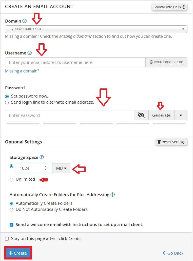 - Unlimited (نامحدود): با انتخاب این گزینه، ایمیل شما میتواند تا کل فضای هاست شما را پر کند. این گزینه برای ایمیلهای عمومی که حجم زیادی از ایمیلها را دریافت نمیکنند، مناسب است.