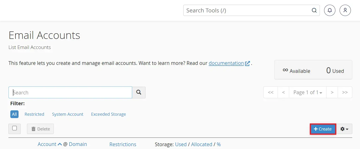 اکنون در صفحه مدیریت حسابهای ایمیل هستید. برای ایجاد یک حساب جدید، روی دکمهی “Create” یا “Create a New Email Account” بزنید.